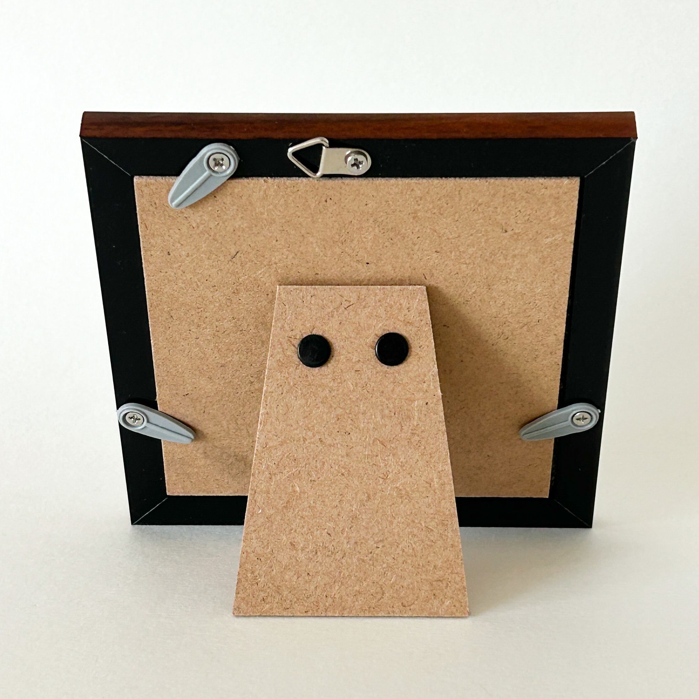 かわいらしい手のひらサイズ、すぐに飾りやすいスタンドつきの額装です(壁掛けもOK)。