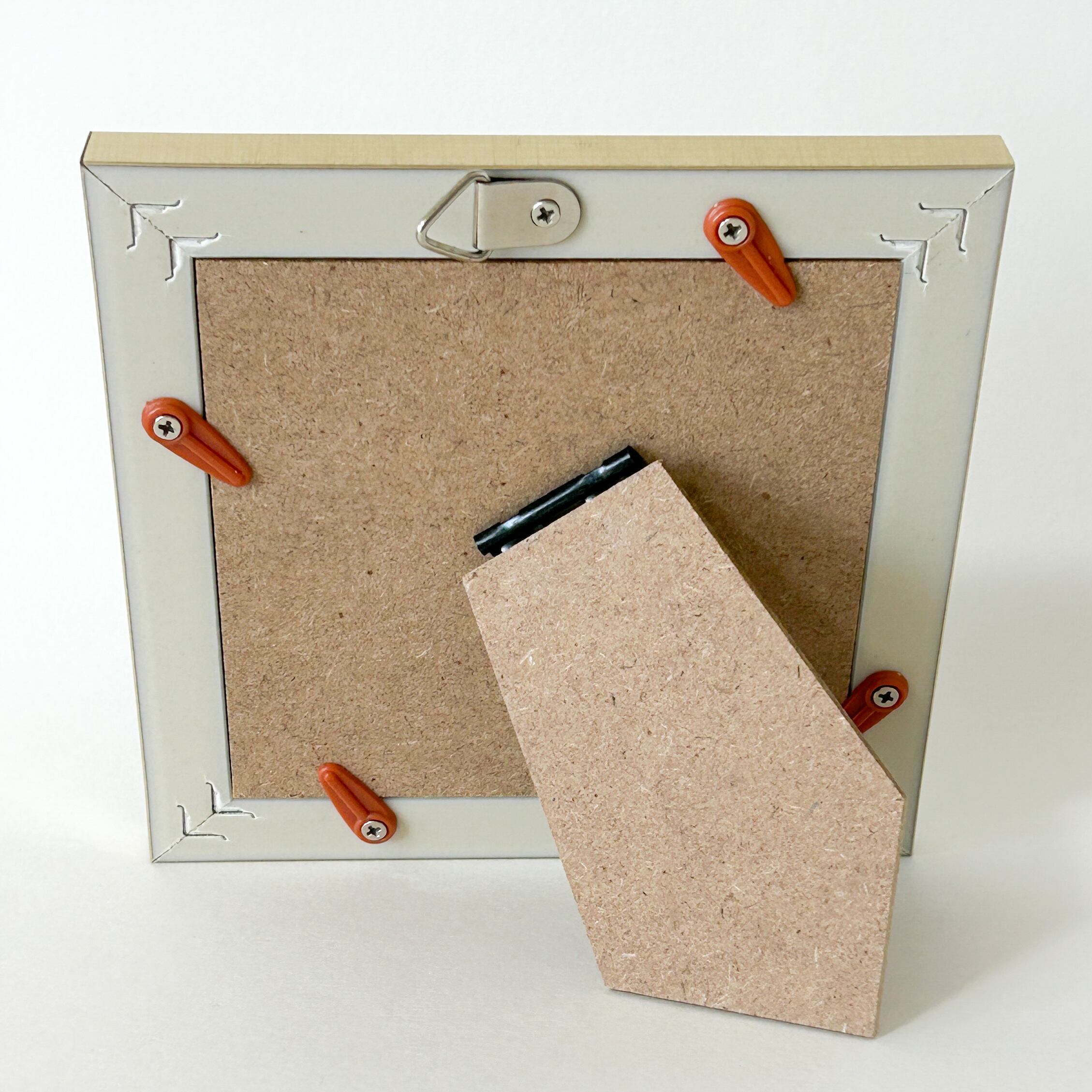 かわいらしい手のひらサイズ、すぐに飾りやすいスタンドつきの額装です(壁掛けもOK)。