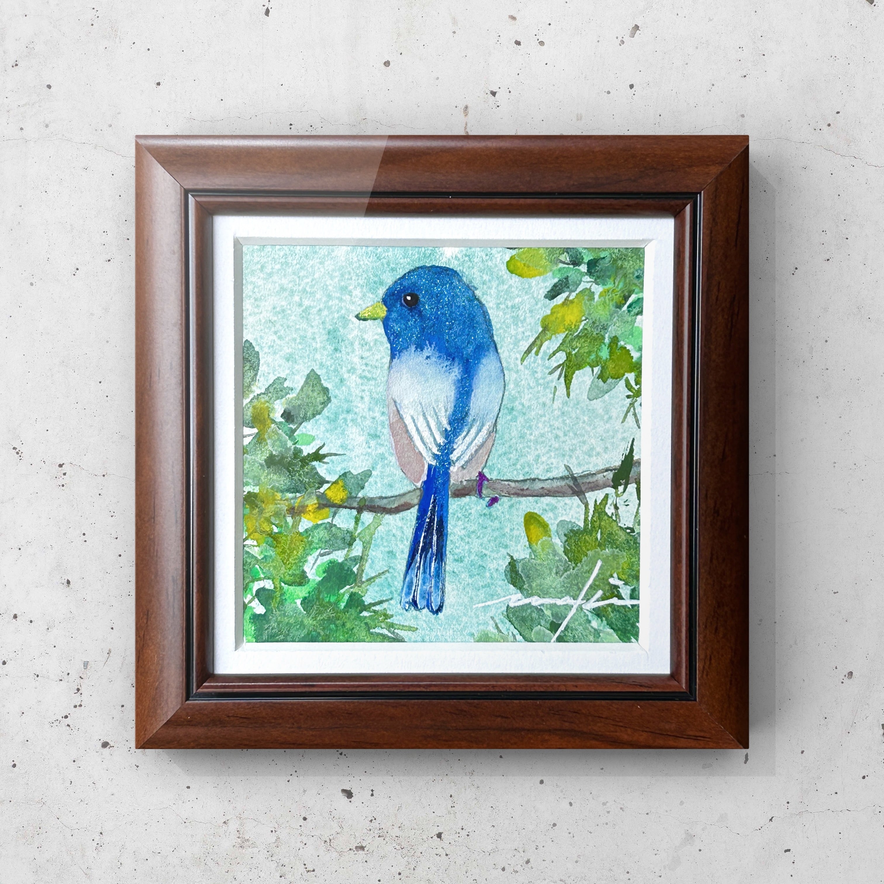 ☆★額装済み、すぐに飾れる、ちいさな青い鳥の絵★☆