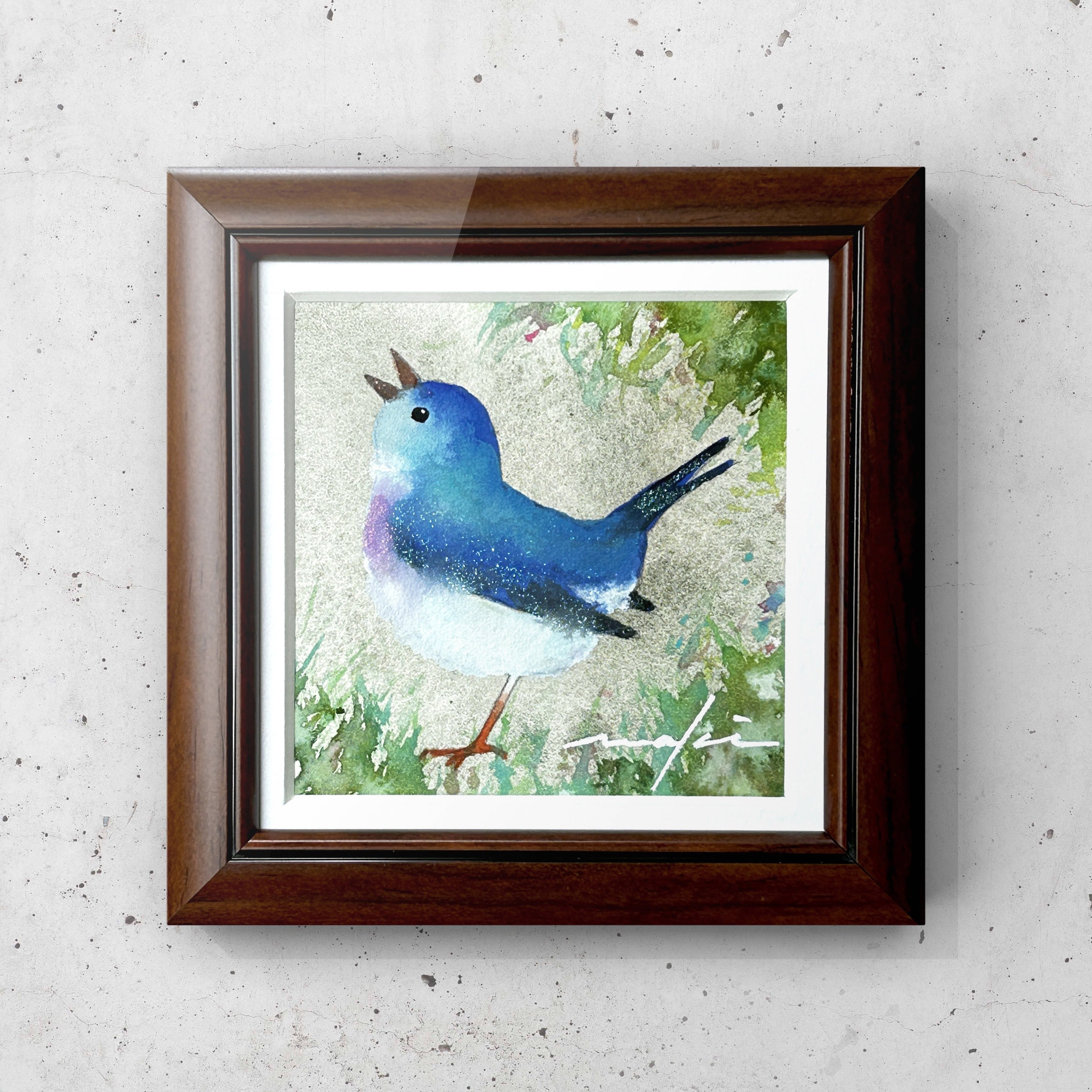 ☆★額装済み、すぐに飾れる、ちいさな青い鳥の絵★☆